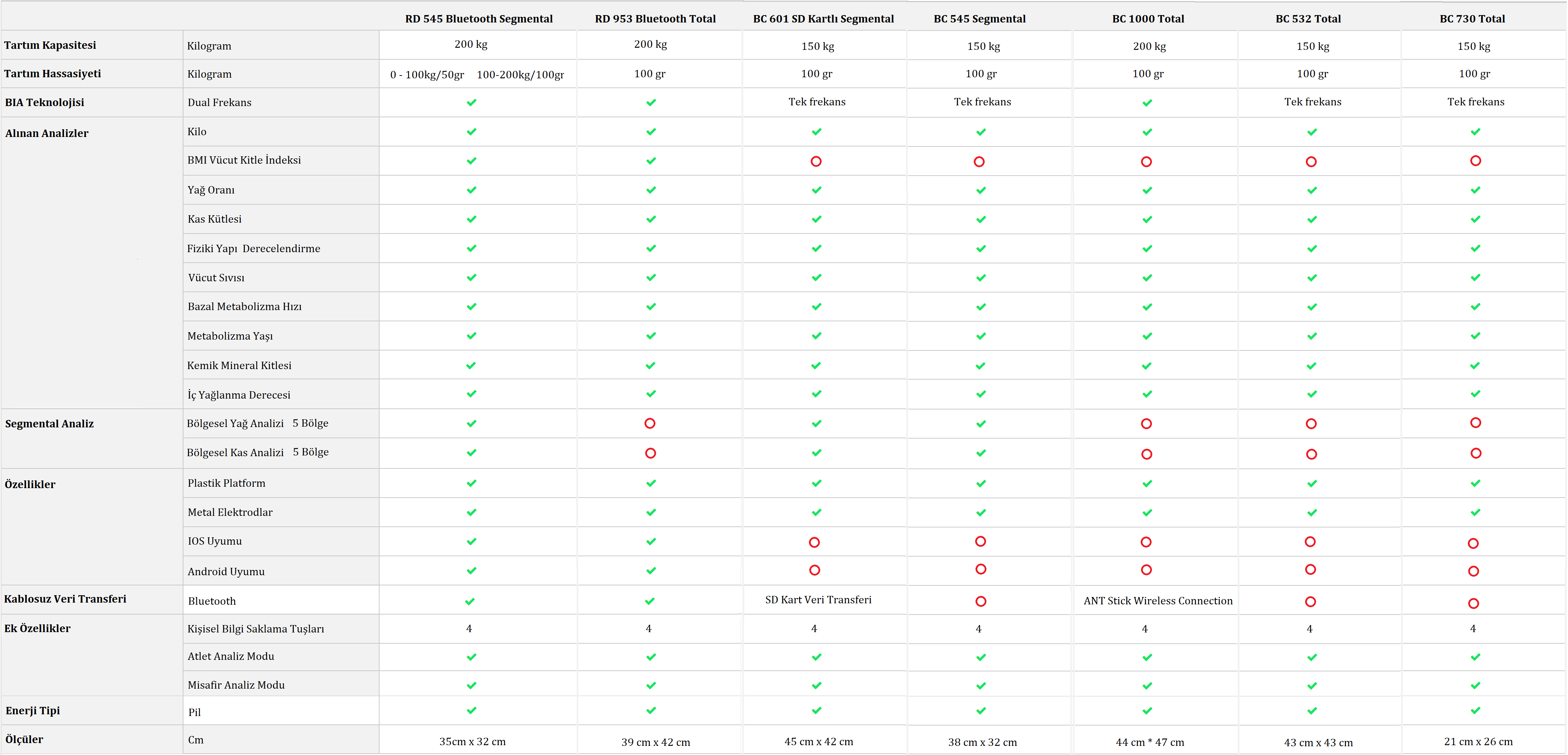 Kilo, Bazal Metabolizma Hızı değeri, Vücut Yağ Yüzdesi (5-99 yaş aralığında), Metabolik yaş, Fiziksel aktivite derecesi, Vücut kütle indeksi, Toplam Kas kütlesi, Kemik mineral ağırlığı, İç yağlanma derecesi; 5 bölgede yağ miktarı ölçümlenmesi; 5 bölgede kas miktarı ölçümlenmesi,