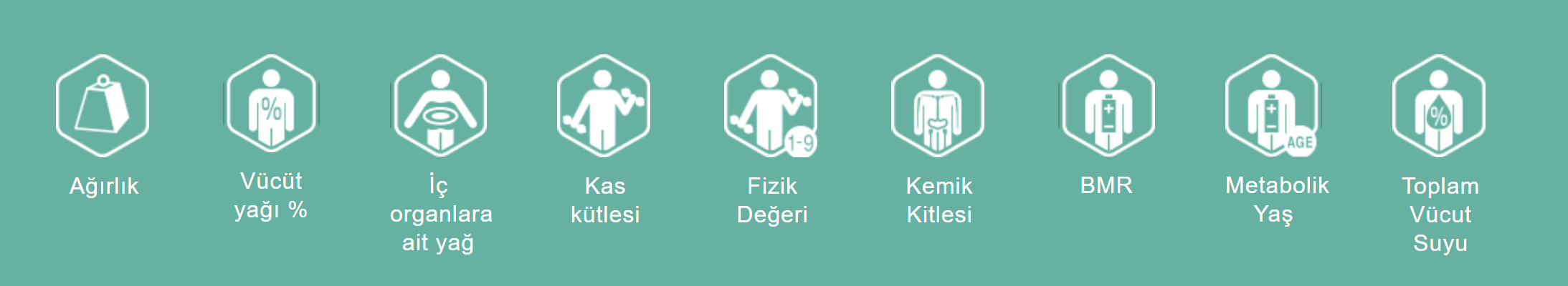 Kilo, Bazal Metabolizma Hızı değeri, Vücut Yağ Yüzdesi (5-99 yaş aralığında), Metabolik yaş, Fiziksel aktivite derecesi, Vücut kütle indeksi, Toplam Kas kütlesi, Kemik mineral ağırlığı, İç yağlanma derecesi; 5 bölgede yağ miktarı ölçümlenmesi; 5 bölgede kas miktarı ölçümlenmesi,