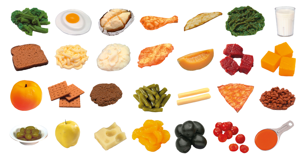 Kepekli Ekmek Dilimi - Makarna - Margarati Pizza Dilimi - Çorba Kaşığı Ölçüsü - Kraker - Peynir Küpleri - İsveç Peyniri - Dil Peyniri - Süt - Tavuk Göğsü - Sahanda Yumurta - Tavuk But - Sığır Eti - Levrek - Yeşil Elma - Kavun Dilim - Üzüm - Mandalina - Şeftali - Taze Fasulye - Barbunya - Brokoli - Fırın Patates - Ispanak - Patates Püresi - Siyah Zeytin - Cherry Domates - Hamburger köftesi